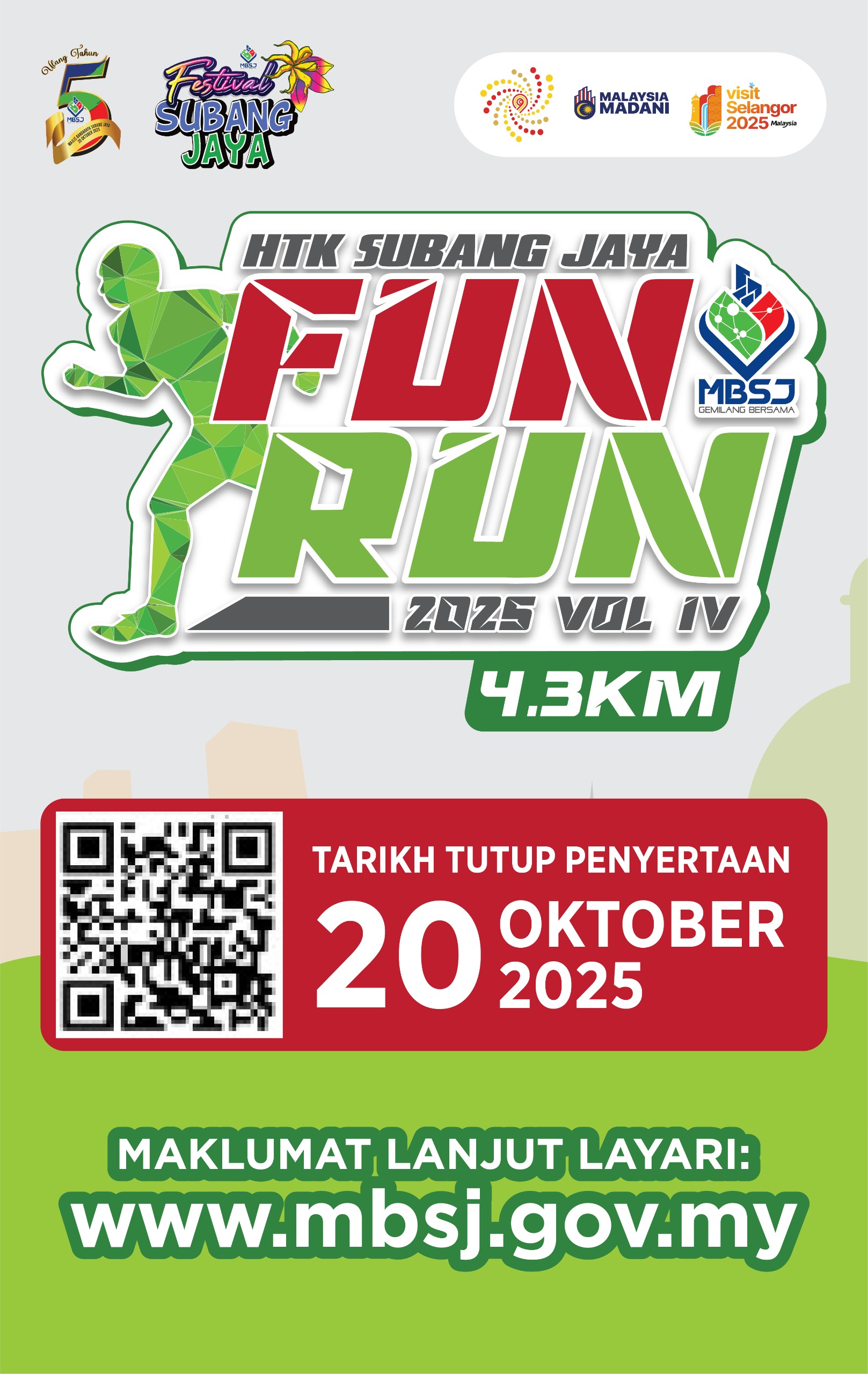 Ayuh gegarkan Program Fun Run 4.3KM dengan semangat gaya hidup sihat & aktif bersama komuniti Subang Jaya sempena Festival Subang Jaya & Sambutan Ulang Tahun ke-5 MBSJ seperti butiran berikut: